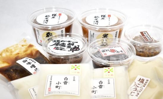 寒仕込み味噌500g、蔵出し味噌500g、南蛮納豆100g、金山寺味噌100g、便利から味噌80g、塩こうじ250g、味噌漬100g、甘酒250g